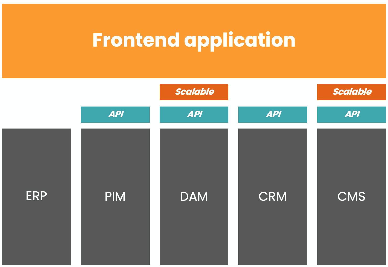 This is a generic setup of a Composable approach powering a frontend application. Frontend developers will need to handle the unifying of all datasets and someone needs to handle access to each system.